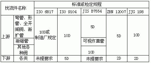 為獲得正常測量精確度,電磁流量傳感器上游也要有一定長度直管段,但其長度與大部分其它流量儀表相比要求較低。90°彎管、T形管、同心異徑管、全開閘閥后通常認為只要離電*中心線(不是傳感器進口端連接面)5倍直徑(5D)長度的直管段,不同開度的閥則需10D;下游直管段為(2~3)D或無要求;但要防止蝶閥閥片伸入到傳感器測量管內(nèi)。各標準或檢定規(guī)程所提出上下游直管段長度亦不一致,匯集如表1所示,要求比通常要求高,這是由于為保證達到當前0.5級精度儀表的要求。表1