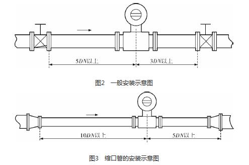 油田污水流量計(jì)廠(chǎng)家的安裝質(zhì)量對(duì)其測(cè)量結(jié)果的影響較大,因此在安裝時(shí)需要注意幾個(gè)問(wèn)題。*先,油田污水流量計(jì)廠(chǎng)家直管段的選擇在配管時(shí)一定要按照要求進(jìn)行選擇,一般選擇流量計(jì)通徑與工藝管道通徑相同,即可滿(mǎn)足工程需要,而且安裝方便、壓力損失小,流量計(jì)直管段上游側(cè)的長(zhǎng)度不少于5倍工藝管道直徑,下游側(cè)的長(zhǎng)度不少于3倍工藝管道直徑(圖2)。但在流速太慢而又要求精度較高或需要變徑的應(yīng)用場(chǎng)合,可選擇通徑小于工藝管道通徑的流量計(jì),以提高測(cè)量精度,此時(shí)流量計(jì)上、下游必須加裝異徑管,且進(jìn)口異徑管上游側(cè)應(yīng)有長(zhǎng)于10倍工藝管道直徑的直管段,下游側(cè)應(yīng)有長(zhǎng)于5倍工藝管道直徑的直管段(圖3)。