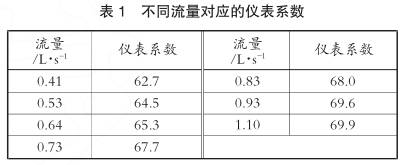 其中自變量為流量,因變量為儀表系數(shù)。當(dāng)流量介于0.4~1L/s時,采用式(1)進(jìn)行計算;當(dāng)流量超過1.1L/s時,保持儀表系數(shù)恒為69.9。