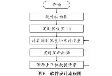 上電后程序?qū)SP的硬件資源進(jìn)行初始化,包括中斷系統(tǒng)、GPIO口、定時器/計數(shù)器、通信端口及基本的時鐘設(shè)置。程序每秒對接收到的脈沖進(jìn)行計數(shù),其除以儀表系數(shù)后的結(jié)果作為瞬時流量,同時在時間上對瞬時流量進(jìn)行累積,計算出兩種流量后,將其實時顯示在液晶顯示屏上,同時將數(shù)據(jù)保存,**等待上位機(jī)電腦對數(shù)據(jù)的讀取。通信采用MODBUS協(xié)議,波特率為9600b/s,無校驗,8位數(shù)據(jù)位,1位停止位。圖6為微處理器功能設(shè)計流程圖。