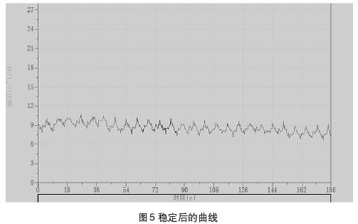 圖4、圖5中所示曲線為測(cè)量過(guò)程中所截取的集流傘中所聚集的氣相,通過(guò)排氣通道排出時(shí)與排出后的測(cè)量曲線。測(cè)試過(guò)程中錄取到的儀器排氣的過(guò)程,當(dāng)集流傘完全支開(kāi)后仍需要開(kāi)啟流量測(cè)試進(jìn)行實(shí)時(shí)檢測(cè),否則可能會(huì)錄取資料失真。