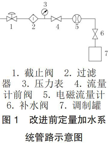 工廠的香料廚房系統(tǒng)為國(guó)內(nèi)煙機(jī)公司 2004 年設(shè)計(jì)制造,其定量加水系統(tǒng)主要由水源、白酒流量計(jì)、加水管路元件和控制程序這四部分組成,改進(jìn)前管路示意圖如圖 1 所示。