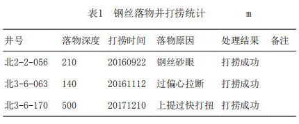 表1為一體式渦街流量計(jì)打撈統(tǒng)計(jì)表,可以看出自2016年9月開(kāi)始即在現(xiàn)場(chǎng)進(jìn)行了應(yīng)用。為了展示試驗(yàn)成果的普遍性,分別從不同注入方式、不同落物深度、不同落物原因的角度,共應(yīng)用3口鋼絲落物井,打撈成功為100%。