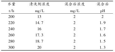 (2)加酸期間附企水處理公司人員負責(zé)每0.5h在高架水槽處化驗污環(huán)水pH值,每2h監(jiān)測一次高架水槽內(nèi)掛片腐蝕情況,將化驗結(jié)果告知燃氣崗位人員,崗位職工負責(zé)記錄。當pH小于6時,附企給水人員在高架水槽處加入堿液進行調(diào)整,同時根據(jù)洗滌塔循環(huán)水量變換情況調(diào)整清洗劑濃度見表3。